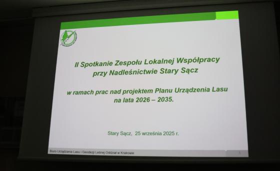 25 września 2025 roku w siedzibie Nadleśnictwa Stary Sącz odbyło się II Spotkanie Zespołu Lokalnej Współpracy, w którym pełniło funkcję prelegenta Biuro Urządzania Lasu i Geodezji Leśnej w Krakowie. W spotkaniu uczestniczyli przedstawiciele społeczności lokalnej, samorządów, branży drzewnej oraz środowisk naukowych. Tematem przewodnim była kontynuacja działań nad wyznaczeniem obszarów leśnych o zwiększonej funkcji społecznej – terenów, w których realizacja funkcji społecznych staje się priorytetem, przy jednoczesnym zachowaniu funkcji ochronnych i gospodarczych lasu.